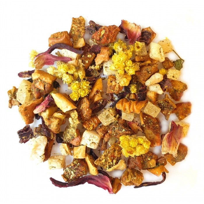 Appel, ananas, honingmeloen (meloen, suiker, fructosesirop), zure appel (appel, citroenzuur, verzuringsmiddel), aroma, watermeloen, hibiscus, rode biet, bramenblad, kattenpootjes, vlierbloesem.