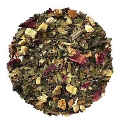Groene mate, citrus schillen, kaneel, cichoreiwortel, zoethout, pepermunt, rozenblaadjes. Let op met zoethout, dit kan bloeddruk verhogend werken.